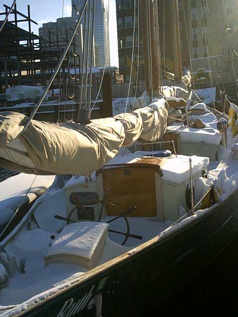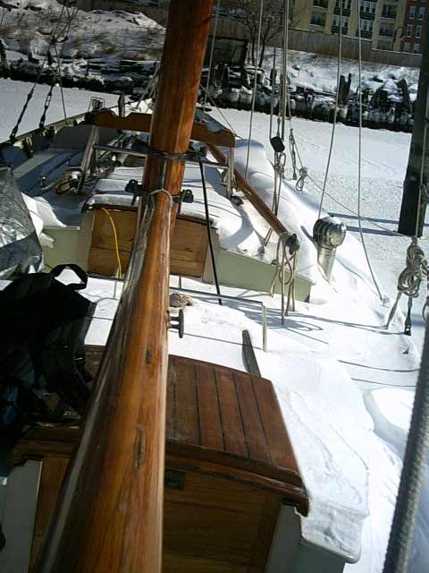 Rosemary Ruth froze in quite happily in late January, 2005. Bowsprit, gaffs and booms (except main boom, which was too big) were taken below and varnished (Helmsman Spar Polyurethane, mixed with turpentine, Japan Drier and black paint). After the snow had stopped, the wind continued, making it an ideal day to sand off the old varnish on the gaffs, because the wind kept the dust away. |