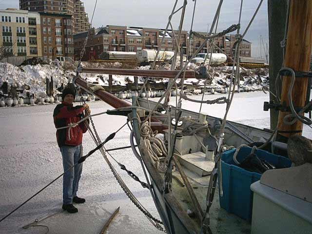 At long last! Finally sailing! A beautiful day in New York Harbor, February 27, 2005, light winds, sunny, temperature a little above freezing...who could ask for better weather :-). | Doing the kind of adjustments expected during a test sail...