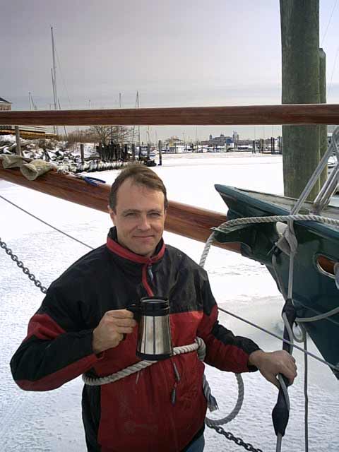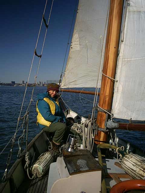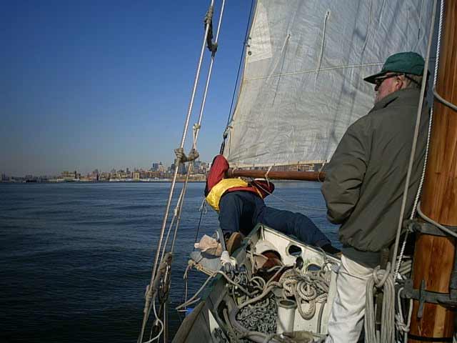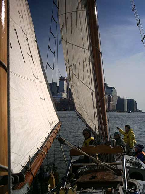 At long last! Finally sailing! A beautiful day in New York Harbor, February 27, 2005, light winds, sunny, temperature a little above freezing...who could ask for better weather :-). | Doing the kind of adjustments expected during a test sail...