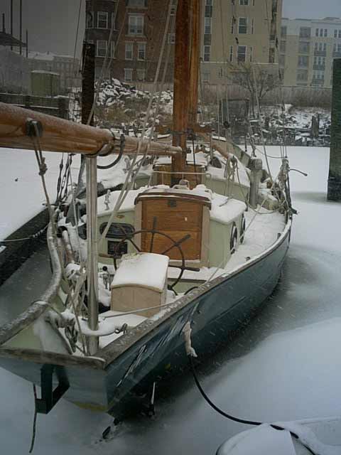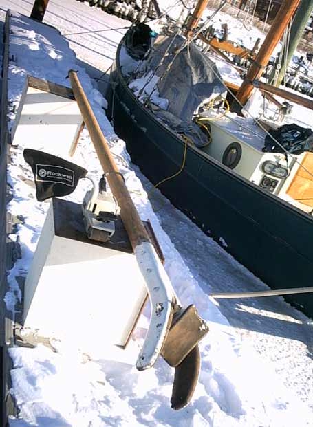 Rosemary Ruth froze in quite happily in late January, 2005. Bowsprit, gaffs and booms (except main boom, which was too big) were taken below and varnished (Helmsman Spar Polyurethane, mixed with turpentine, Japan Drier and black paint). After the snow had stopped, the wind continued, making it an ideal day to sand off the old varnish on the gaffs, because the wind kept the dust away. |