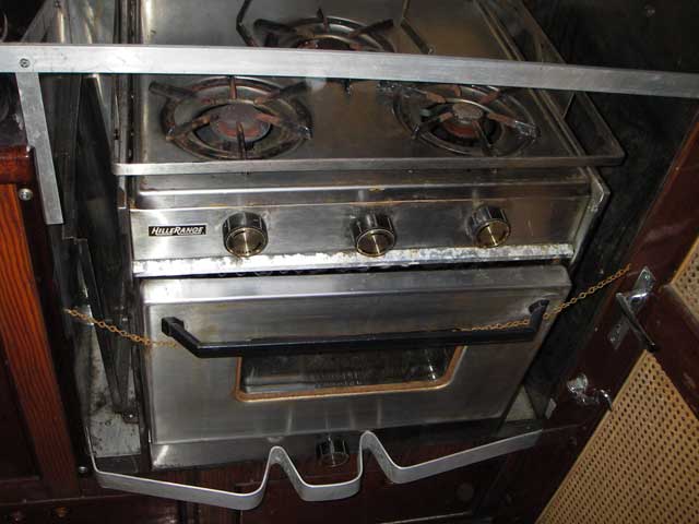 Hillerange 3 burner kerosene (paraffin) stove with oven. Fuel tank is in engine room. |