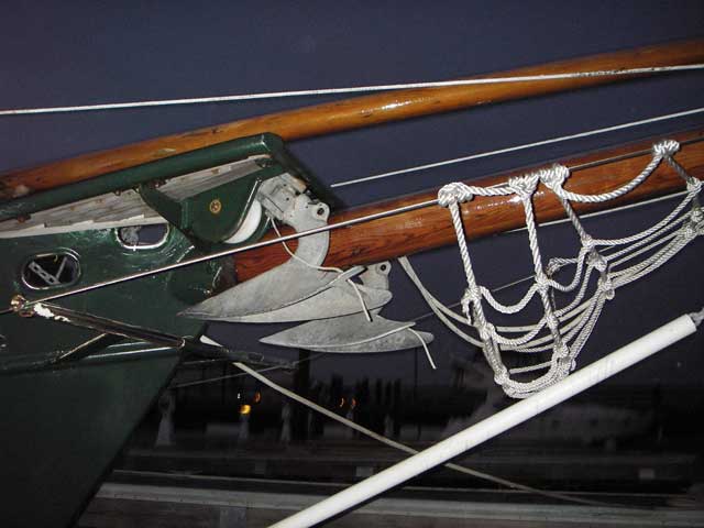 genuine CQR anchors, on hefty rollers on bowsprit platform. |