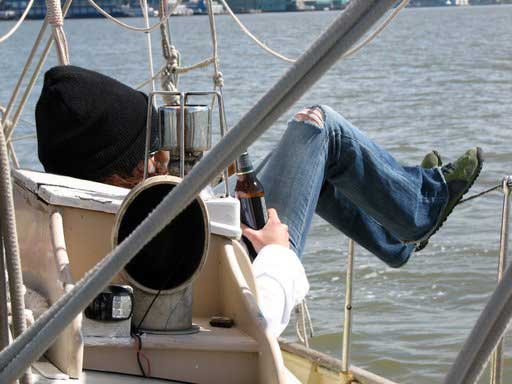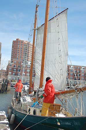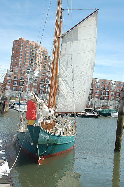 Sailing off dock on a March day under foresail alone. |