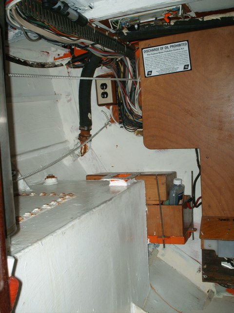 Two fuel tanks, builtin, in engine room, 90 gallons (340 l) total. Large cleaning/inspection plates on top of tanks. | ![]()