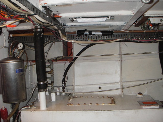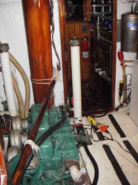 Engine room, starboard side, looking aft to aft cabin.and looking forward to fwd cabin. Black hoses are engine cooling (thin) and exhaust (thicker). Light grey hoses are water tank fills. The two vertical white poles are 316 stainless standpipes, where seawater comes into the boat. Underneath them (not shown) are grates that can be removed for cleaning (on the bottom of the hull). All the seawater inlets come off these standpipes. |