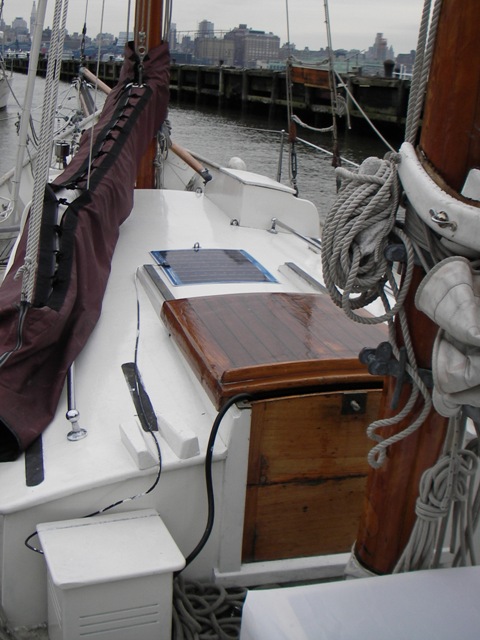 Semi-rigid solar panel attached to forecabin top. Flexible Uni-Solar panel tied to aft cabintop. |
