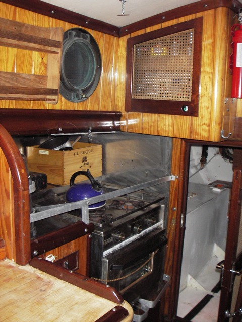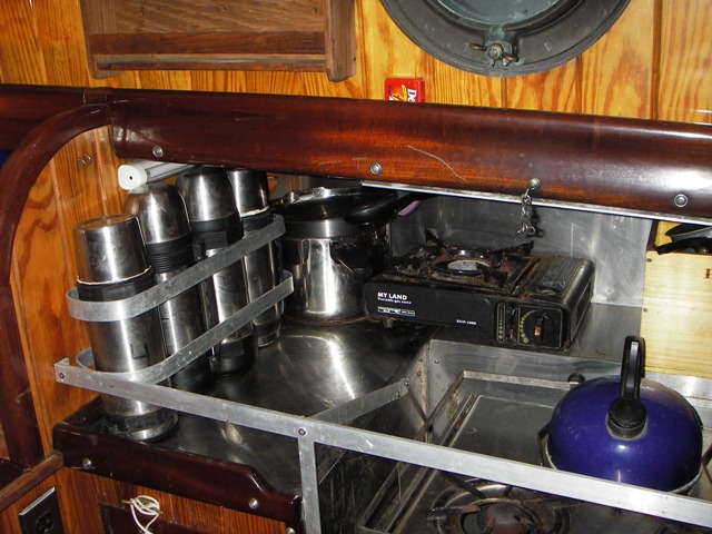 Area around stove covered with SS plate for safety. Rack for four Thermoses--these get used extensively on overnight sails and cold-weather sails. |