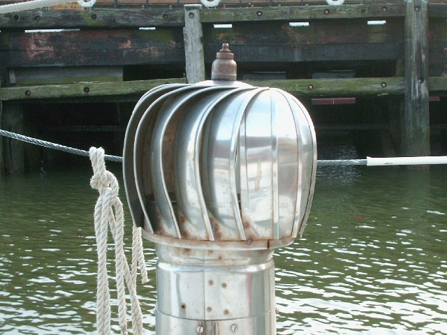 Two Dorade-type ventilators incorporated into deckboxes. Engine room ventilation incorporated into two other deckboxes. Galley has a self-powered exhaust vent on deck over stove. |