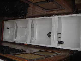 There are two good berths and two settees that can be used as berths in the forward cabin. The aft cabin has a single berth that slides out to become a double berth. Cushions and leecloths on all berths. |