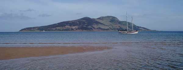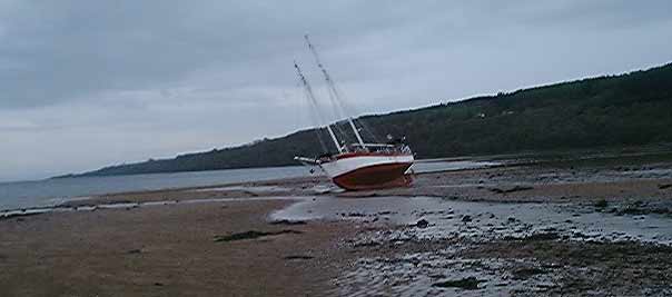 One of the repair jobs to be done was to repack the stuffing box. This requires being out of the water. There was no convenient wall to lie against in Lamlash, so Orbit was beached to do the work. Beaching just involves dropping a stern anchor (to pull off with later), and then running aground (on soft ground) shortly after high water. After the boat is aground, weight is put on one side to ensure that it lays on one side (if standing upright on its keel, it could crash over later if weight shifted), and when the tide goes out, the boat is safely ashore. When the tide comes back in, hauling on the stern anchor pulls the (now floating) boat towards deeper water.